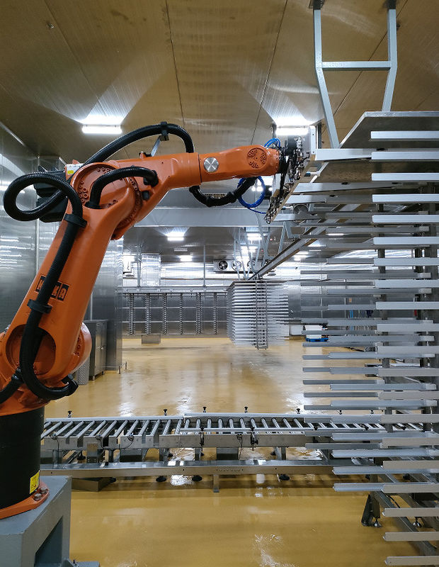 Обработка сыпучих пищевых продуктов: В таких секторах, как сельское хозяйство, робот может паллетировать сыпучие продукты, например, штабелировать лотки для яиц. Роботы KUKA известны бережным обращением с хрупкими продуктами, обеспечивая минимальное количество поломок.